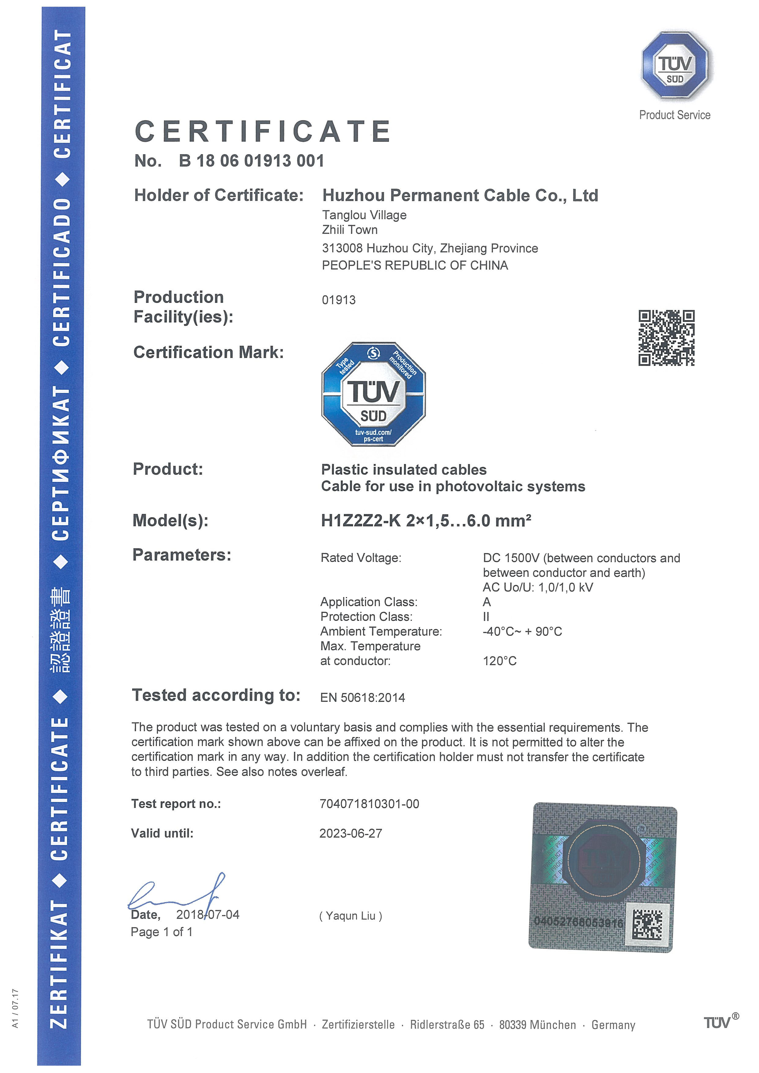 2016年--2018年,我司先后獲得了CE證書(shū)和TUV證書(shū), 通過(guò)了SGS的第三方驗(yàn)廠(chǎng)。2017年-2018年,2年的時(shí)間內(nèi),在新能源領(lǐng)域--光伏電纜, 取得了重大進(jìn)步。
